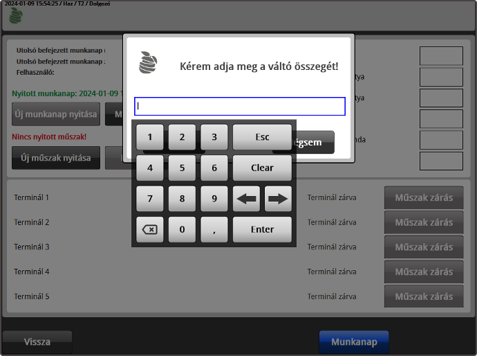 Ha a rendszer össze van kötve adóügyi eszközzel (pénztárgép vagy nyomtató), a műszak nyitás során felugrik egy ablak, ahol a kasszában található váltópénz mennyiségét kell begépelni.