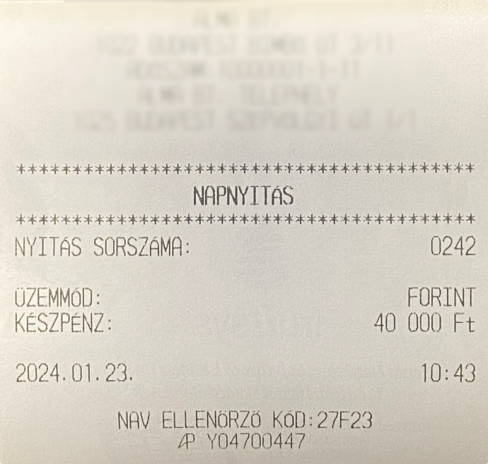 gomb megnyomása után a begépelt összeg bekerül az adóügyi nyomtatóba, ami kinyomtatja a napnyitás bizonylatát.